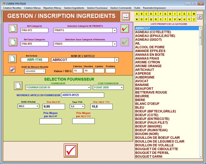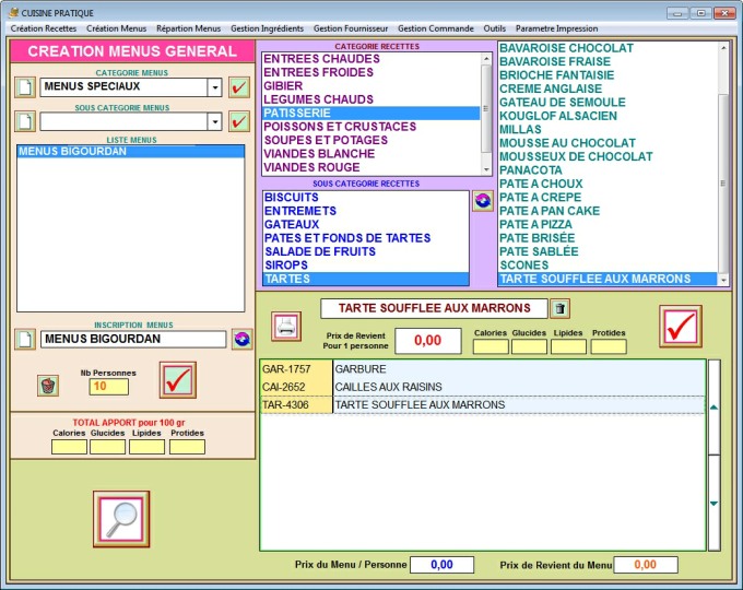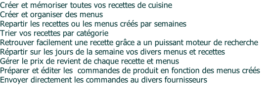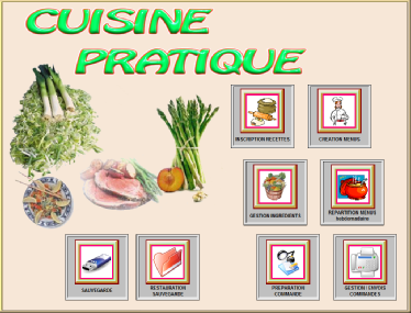 Cuisine pratique est un logiciel de cuisine simple et convivial, destiné aussi bien à un usage professionnel que familial. Elaborez des recettes de cuisine, créez des menus, gérez votre cave à vins et vos fournisseurs. Le programme permet notamment la création et la mémorisation de vos recettes de cuisine, l'affichage de leurs apports caloriques et la gestion du prix de revient de chaque recette.