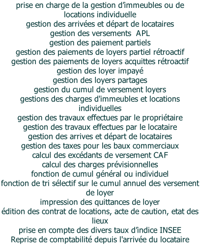(localisation des appartements, nom et date d'entrée des locataires, encaissement des loyers et émission des quittances, suivi des augmentations à imputer au locataire, )